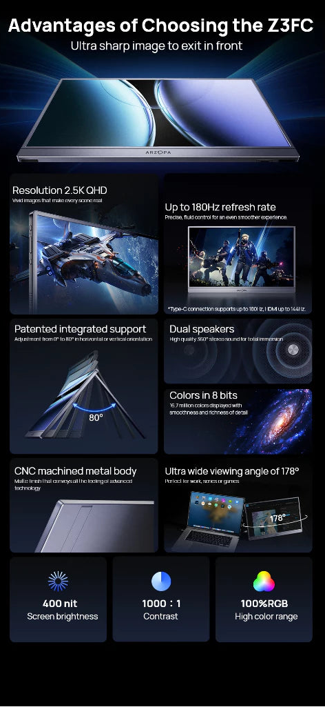 Key features of the Z3FC display, highlighting its stunning 2.5K QHD resolution, ultra-fast 180Hz refresh rate, and wide 178° viewing angle for an immersive visual experience. It also emphasizes advanced features such as patented adjustable support, dual high-fidelity speakers, CNC-machined metal body, vibrant 8-bit color depth, 400-nit brightness, 1000:1 contrast ratio, and 100% sRGB color range making it a powerful and premium choice for work, entertainment, and gaming.