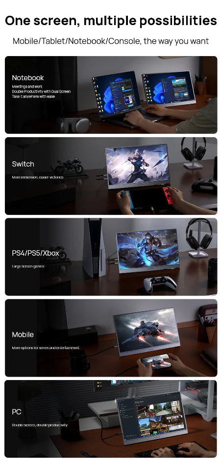 The versatility of a portable monitor that works seamlessly with multiple devices including notebooks, Nintendo Switch, PS4/PS5/Xbox consoles, mobile phones, and PCs. Each section visually demonstrates how the screen enhances productivity, gaming immersion, and on-the-go entertainment, showcasing its adaptability no matter what device you use. Perfect for multitasking, gaming, or extending your workspace anytime, anywhere.