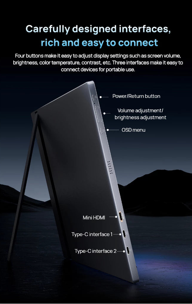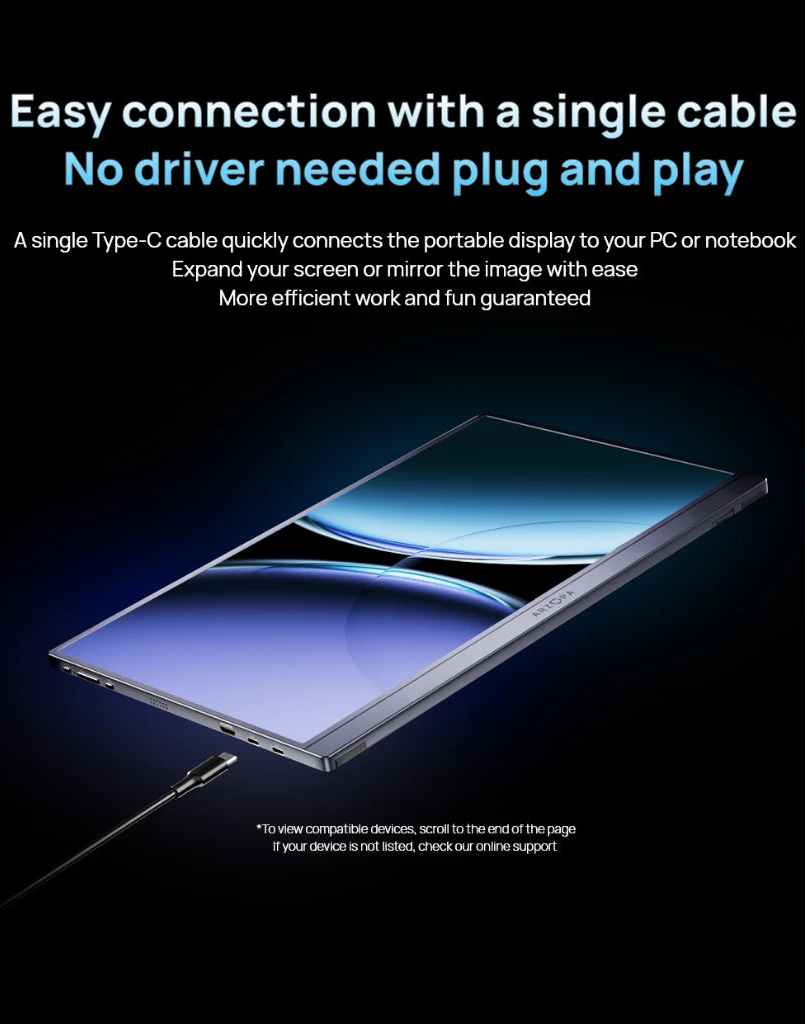 Equipped with two full-function USB-C ports and one Mini HDMI port, this portable screen works instantly with your laptop, MacBook, PS5, Xbox, Steam Deck, and more — no drivers or setup needed.